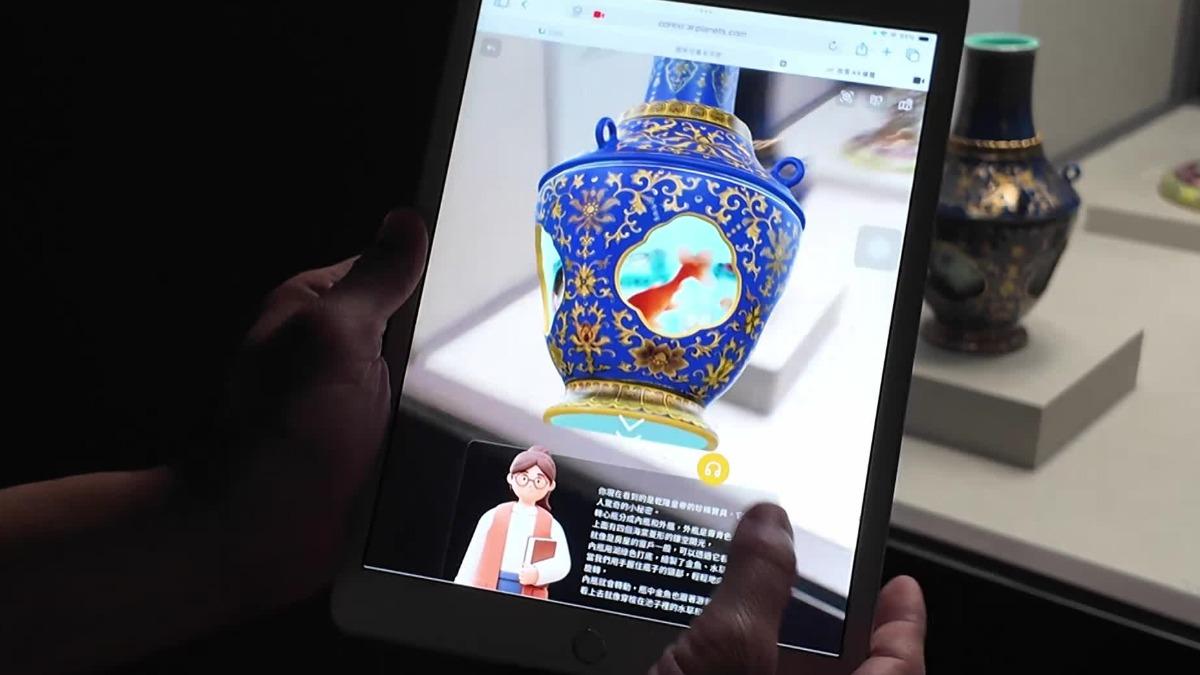 Acoustiguide and Arplanet (宇萌數位科技) developed the service using AI-enhanced exhibit recognition technology. The AR function animates classic works, including a Qing-dynasty revolving vase decorated with swimming fish in cobalt blue glaze (霽青描金游魚轉心瓶). Viewers can examine previously invisible elements like rotating mechanisms and bottom inscriptions.