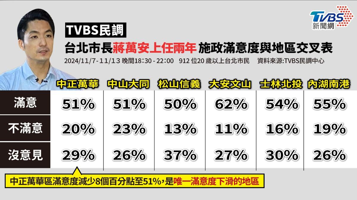 台北市長蔣萬安就任即將滿兩年, 根據《TVBS民調中心》最新調查結果,蔣萬安的施政滿意度持續上升至五成以上。不過值得注意的是,中正萬華滿意度51%,減少8個百分點,不滿意增至20%,是唯一滿意度下滑的行政區。