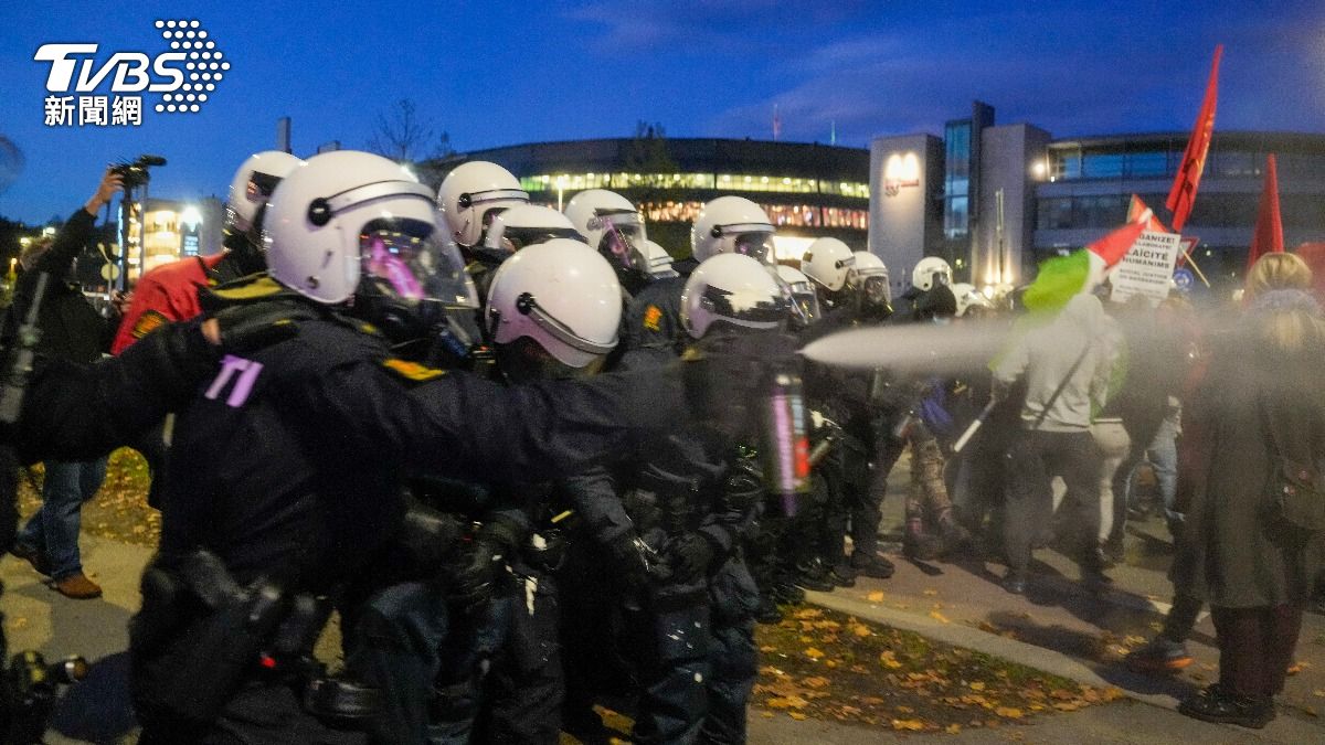 在挪威奧斯陸舉行的挪威對以色列世界盃資格賽比賽期間,場外局勢緊張。支持巴勒斯坦的示威者一路遊行到體育場外表達抗議,現場煙霧迷漫。防爆警察戴著頭盔、防毒面具與示威者對峙,並噴灑催淚瓦斯驅離人群。揮舞著巴勒斯坦旗幟的民眾用手摀住口鼻,尖叫著倒退。抗議者高喊著「你該感到羞恥」、「巴勒斯坦將獲自由」等口號,並點燃紅色信號彈表達不滿。